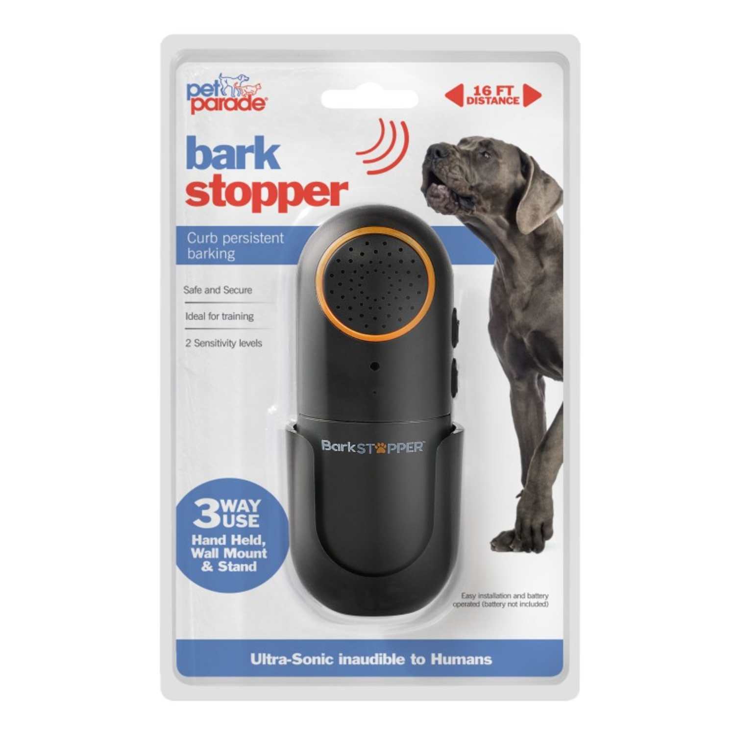Humane way to put a stop to persistent barking. Emits a high-pitched pulse that is inaudible to the human ear but highly irritating to dogs. Dogs will learn to stop behavior associated with harmless sound. Two sensitivity levels.