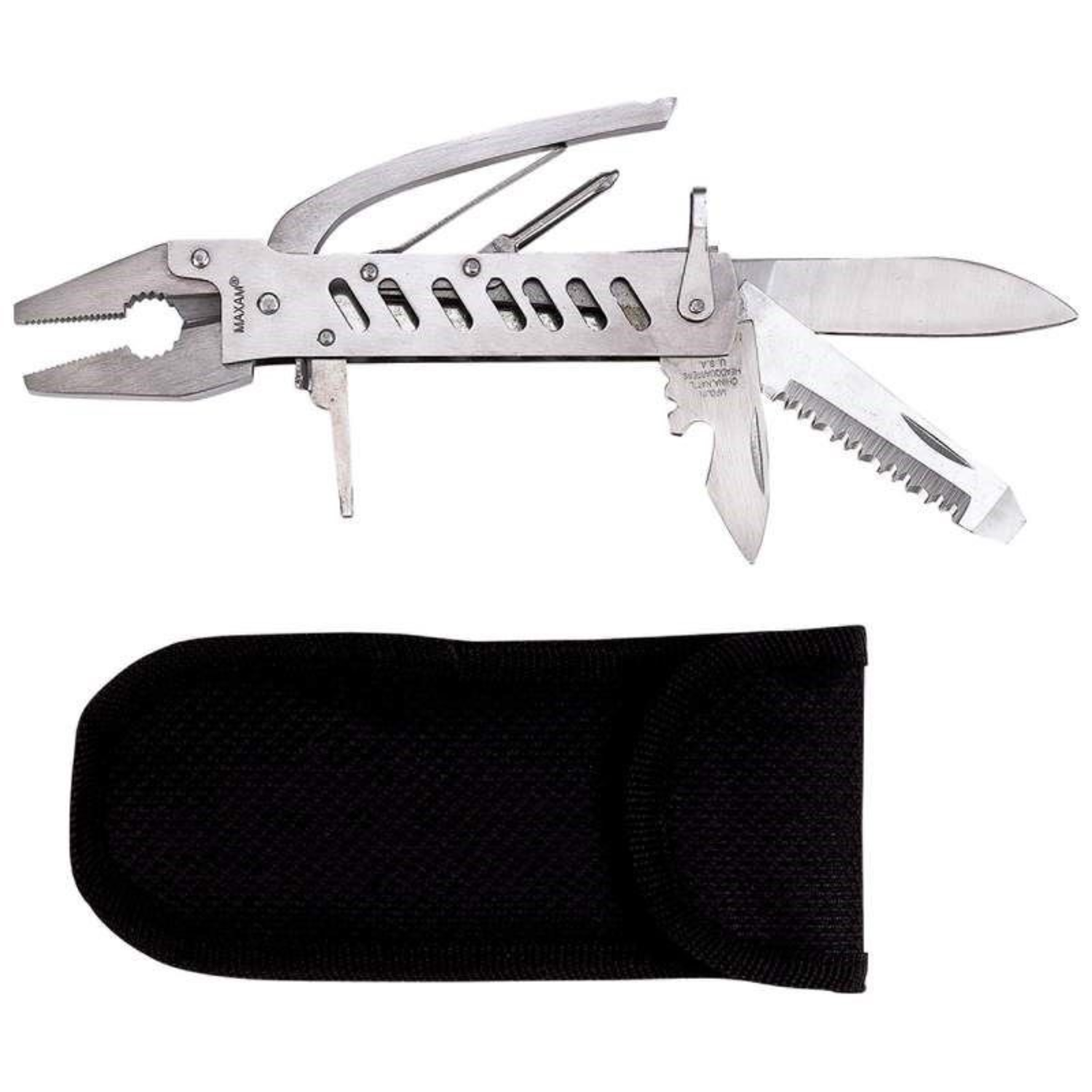 You can have every type tool in one implement to take on most jobs. Made from 420 stainless steel it features needlenose and regular pliers, handle and pry bar, wire cutter, 2 wire strippers, Phillips screwdriver, 2 flathead screwdrivers, file, small blade and large drop point blade, serrated blade, bottle opener and heavy-duty Kelvlon™ sheath. Measures 5-7/8' closed.