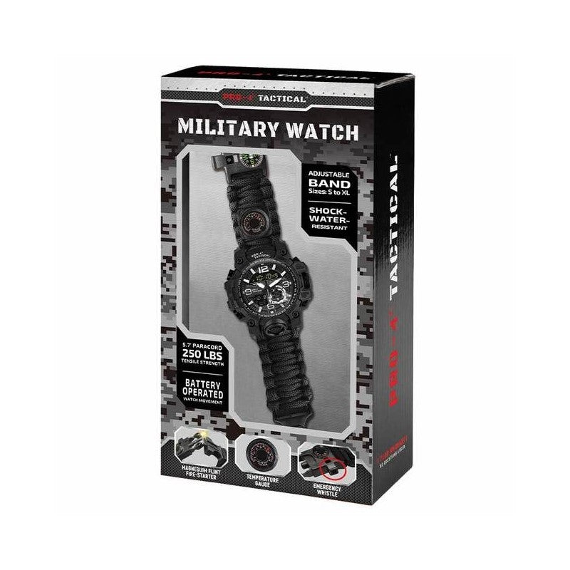 For situations requiring both accurate time and survival tools, the Pro-4 Tactical Military Watch provides both. Wear safety and have emergency tools on your wrist. Summon help (Emergency Whistle); stay warm (Flint Fire-Starter); keep track of the weather (Temperature gauge); stay on the trail (Compass); and fasten loose items (Paracord). Designed for outdoor use and weather resistant, the comfortable Pro-4 Tactical Military Watch has many tools in one.