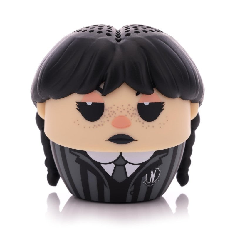 Officially licensed Wednesday Bitty Boomers Bluetooth speaker. Don't be fooled though, what this speaker lacks in size is made up for with mind-blowing sound. Tiny size. Huge Sound. You can also sync 2 speakers together for extra boom! 2in tall; Rechargable.