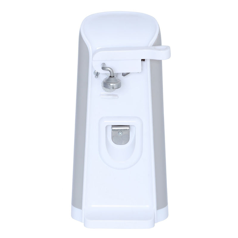 Extra tall can opener is perfect for those taller, larger cans. Includes sharpener tool on back, convient for knife sharpening. Bottle opener on front, convenient for when you need something popped open. Also offers cord storage, perfect for putting away without having the cord get in the way of anything else. Knife sharpener feature on back. Cord Storage. Bottle Opener.