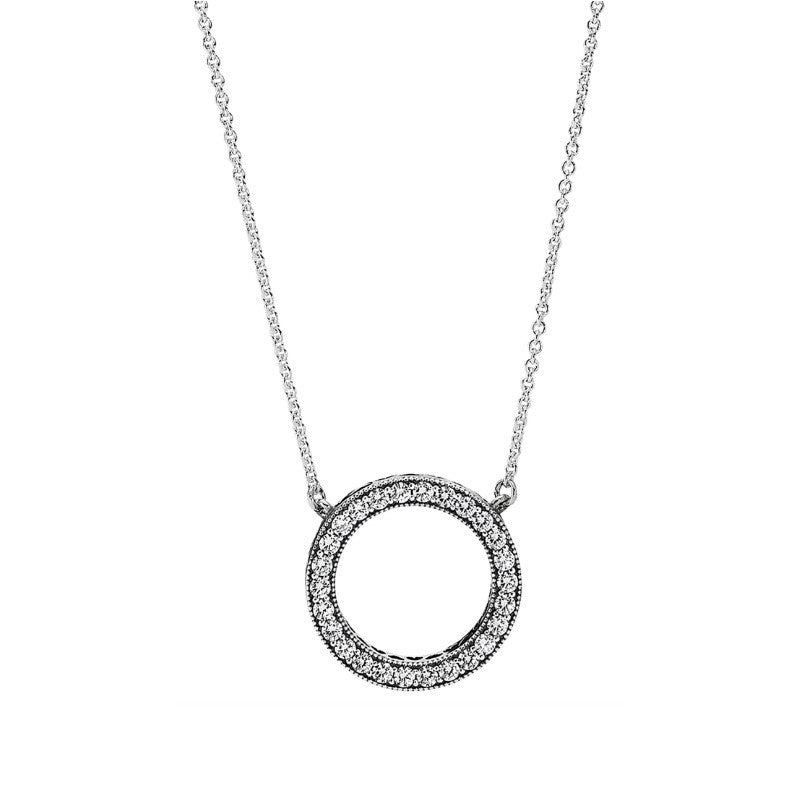 This round pendant features the PANDORA logo on one side and is a reversible collier in sterling silver with 26 bead-set clear cubic zirconia and cut-out heart details on the other. Versitile and stylish, this necklace can be adjusted to suit any look.